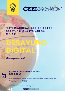 "Internacionalización de las startups: cuanto antes, mejor" El próximo día 25 de febrero, de 9:30h a 10:30h, CEEIARAGÓN, sociedad adscrita a CORPORACIÓN, llevará a cabo un nuevo Desayuno Digital titulado "Internacionalización de las startups: cuanto antes, mejor". La internacionalización de las … [Read more...] about Desayuno Digital CEEI – «Internacionalización de las startups: cuanto antes, mejor»