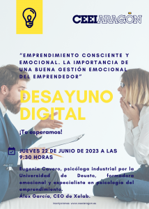 El próximo día 22 de junio, jueves, de 9,30 h. a 10,30 h. llevaremos a cabo un nuevo Desayuno Digital CEEI que lleva por título “EMPRENDIMIENTO CONSCIENTE Y EMOCIONAL. LA IMPORTANCIA DE UNA BUENA GESTIÓN EMOCIONAL DEL EMPRENDEDOR ”. Hoy en día, todas las personas -y los emprendedores también-, nos … [Read more...] about Desayuno digital CEEI “Emprendimiento consciente y emocional. La importancia de una buena gestión emocional del emprendedor”