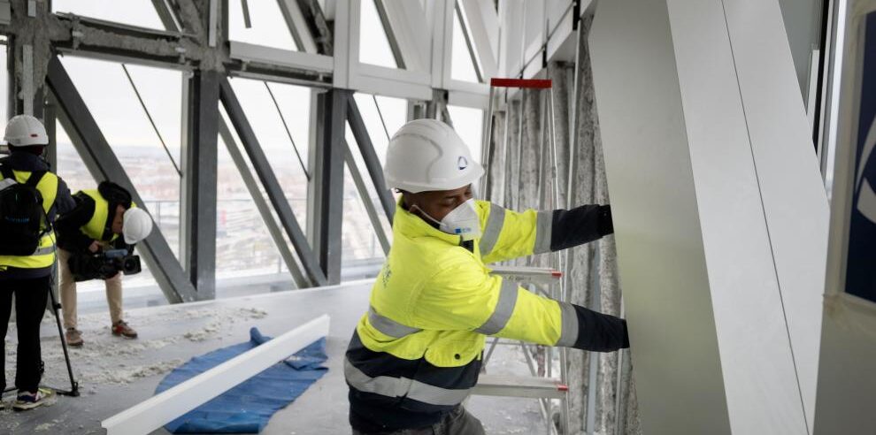 Uno de los datos más impresionantes de la obra es la actuación integral sobre la envolvente del edificio. Es la «piel» de la Torre, compuesta por parasoles y grandes superficies acristaladas.