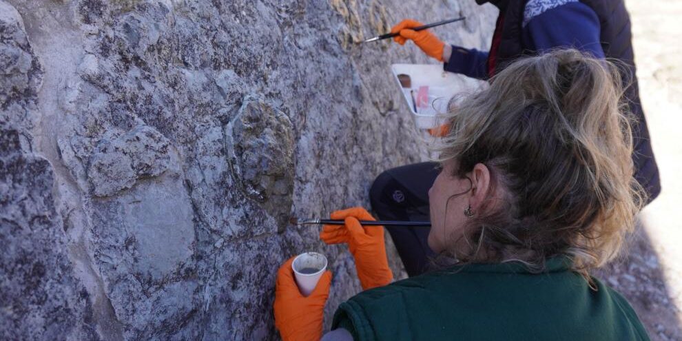 Detalle sobre el proceso de aplicación del producto en las icnitas tridáctilas presentes en un yacimiento de Aguilar del Alfambra (Teruel).