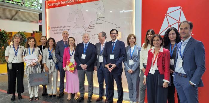 El estand de Aragón Plataforma Logística (APL) está siendo el centro de operaciones de la delegación aragonesa en Múnich, de la que forman parte la directora general de Planificación Estratégica y Logística, Raquel Campos; el director general de Transportes, David Sánchez; la directora gerente de la Fundación Transpirenaica, Cristina García, y el director gerente de APL, Pedro Sas. un espacio que transmite la imagen de Aragón como una gran plataforma logística en su conjunto, en el que destaca la enorme pantalla de 25 metros cuadrados.