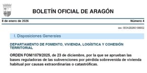 Dichas ayudas se concederán a través de futuras convocatorias mediante las que se prevén cuantías de hasta 70.000 euros en caso de destrucción o ruina inminente de la vivienda El Boletín Oficial de Aragón (BOA) publica hoy las bases reguladoras de las subvenciones que otorgará el Gobierno de … [Read more...] about Publicadas las bases para la concesión de ayudas por pérdida sobrevenida de vivienda habitual